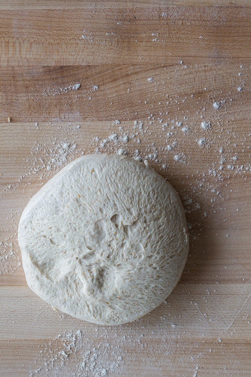 Smooth and strong sourdough pizza dough with lots of fermentation activity at the end of bulk fermentation.