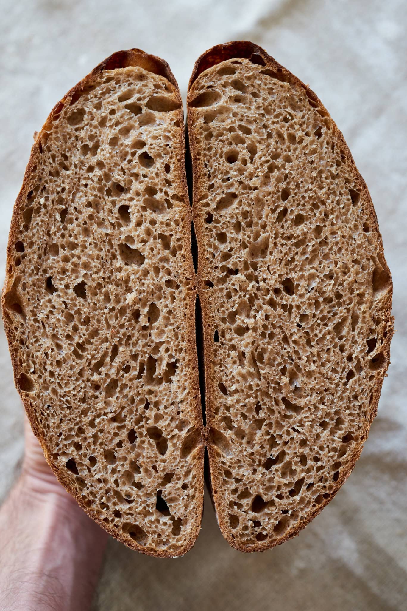 Interior crumb on a 100% whole wheat sourdough bread loaf.