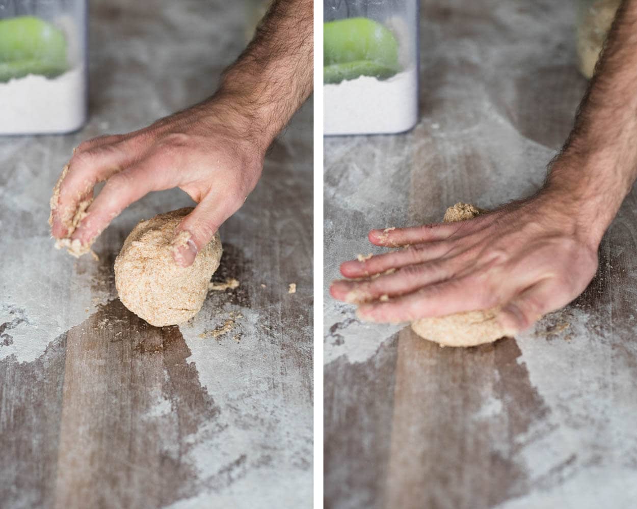 Lightly flour your work surface and scrape out your dough. Using your bench knife, divide the dough in half. Lightly shape each half into a round shape. Let the dough rest for 30 minutes, uncovered.