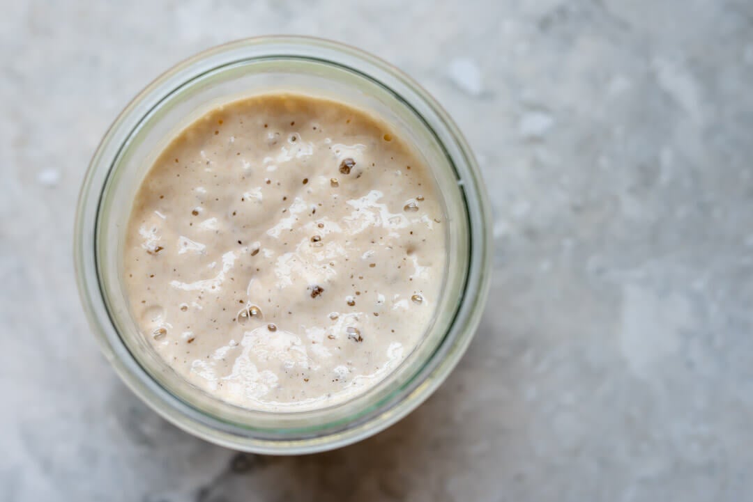 Use your sourdough starter when ripe, mix the above ingredients in a jar, and leave them covered at a warm temperature, 74-76°F (23-24°C), to ripen for 5 hours.