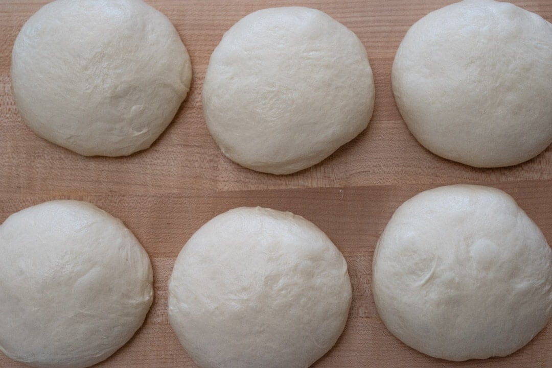 Gently scrape the dough from the bulk container to an un-floured work surface. The dough will feel cold, slightly damp, and firm. Divide into 325g pieces and preshape the pieces of dough into rounds (my preference) or rough tubes. Because the dough is cold and firm, very little bench flour is needed to pre-shape.
