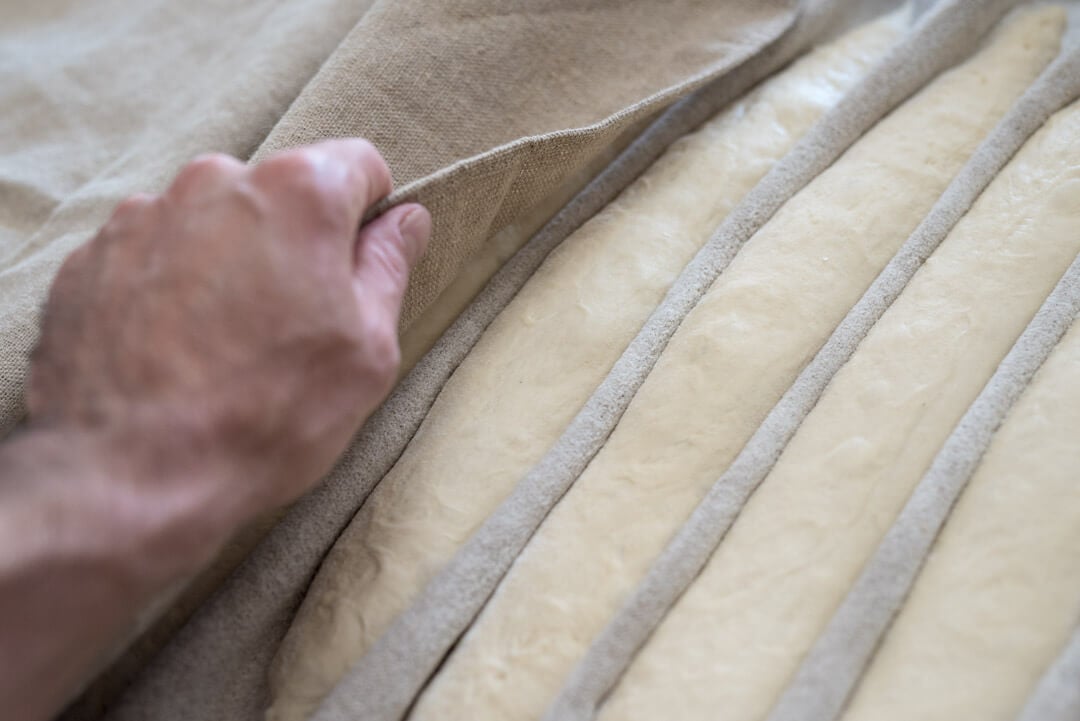 Keep your proofing board away from drafts, as the dough can quickly develop a crust on the outside. It may help to drape the edges of your linen over the shaped baguettes or cover them loosely with plastic. If you cover it with plastic, be aware the dough may stick.