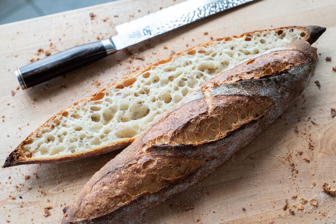 With sourdough baguettes, I find spending a few more minutes developing the dough upfront helpful in achieving a more open crumb. A spiral mixer can help mix this dough quicker and more effectively.