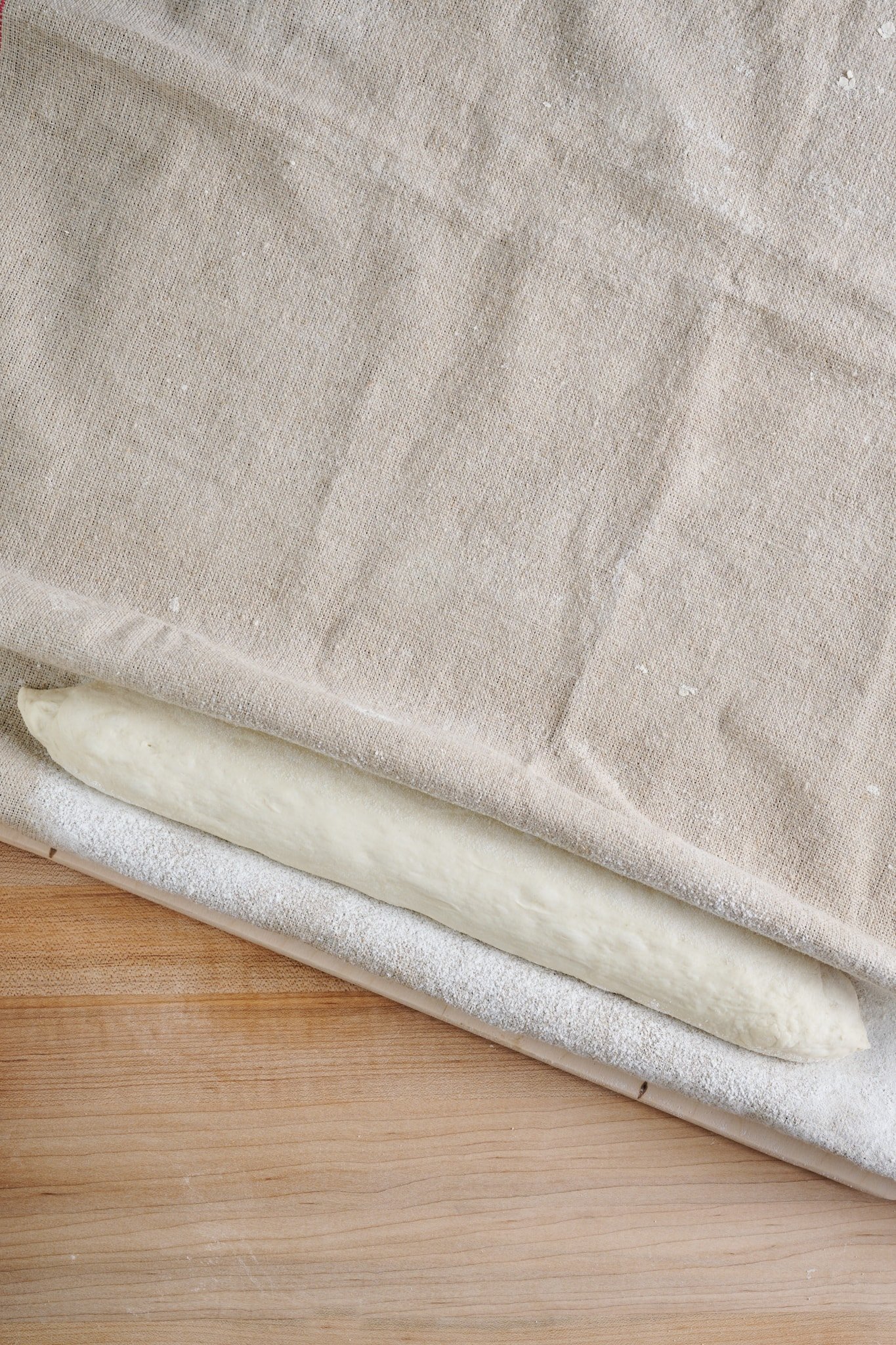 Prepare a couche and dust it with flour. Shape each piece of dough into a baguette shape.