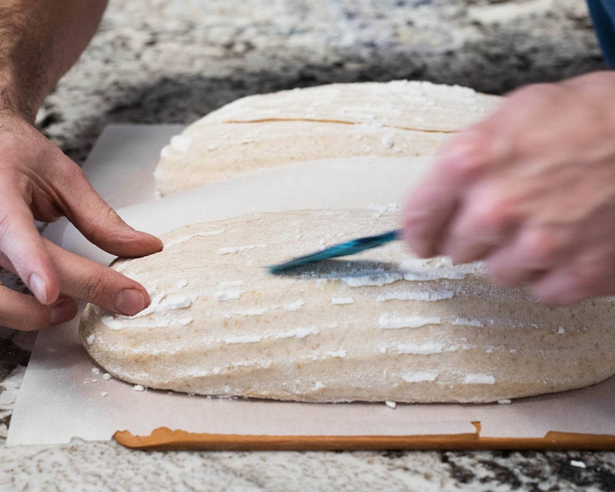 Preheat your oven to 450°F (230°C). Remove the dough from the fridge (there’s no need to let the dough come to room temperature) and uncover. I scored the dough with a single, long slash to get that dramatic opening when baked. I keep the blade at a reasonably shallow angle so the taut skin created during shaping will “peel” back as the loaf rises.
