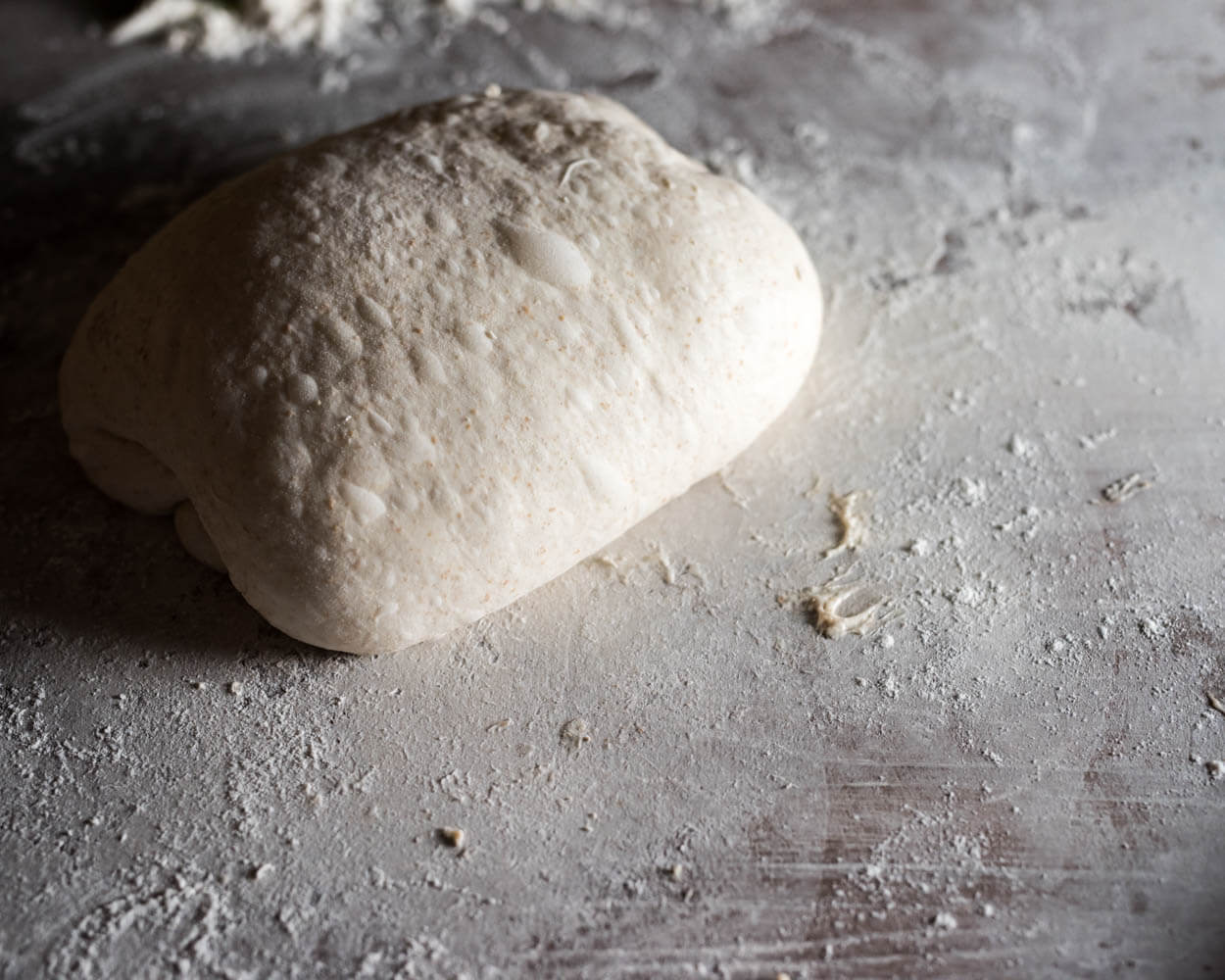 Lightly flour your work surface and scrape out your dough. Using your bench knife, divide the dough in half. Lightly shape each half into a round shape. Let the dough rest for 30 minutes, uncovered.