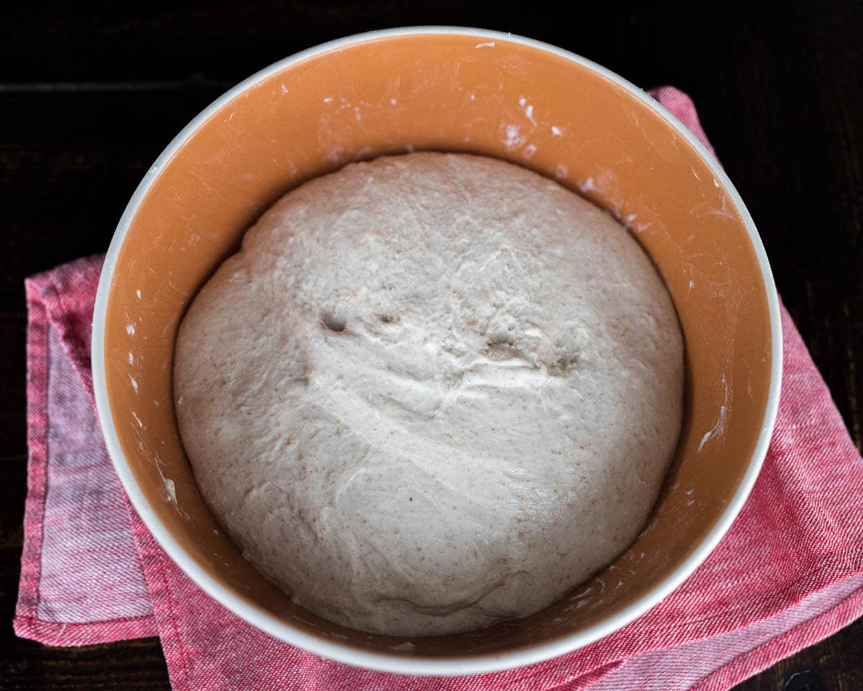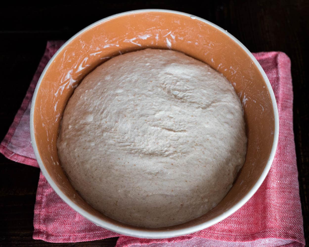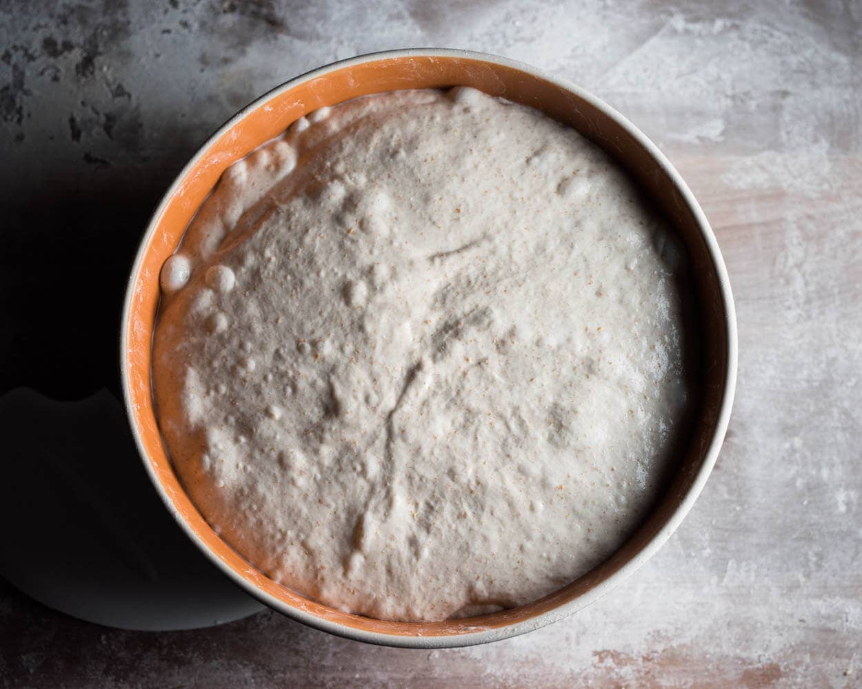 Transfer dough to a tub or thick-walled bowl for bulk fermentation.