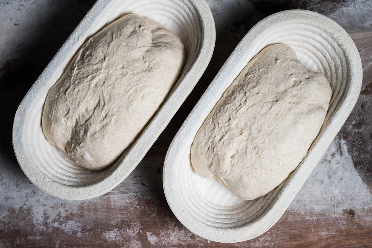 Shape the dough into a round (boule) or oval (batard) and place it in proofing baskets. Cover the baskets with a reusable plastic bag.