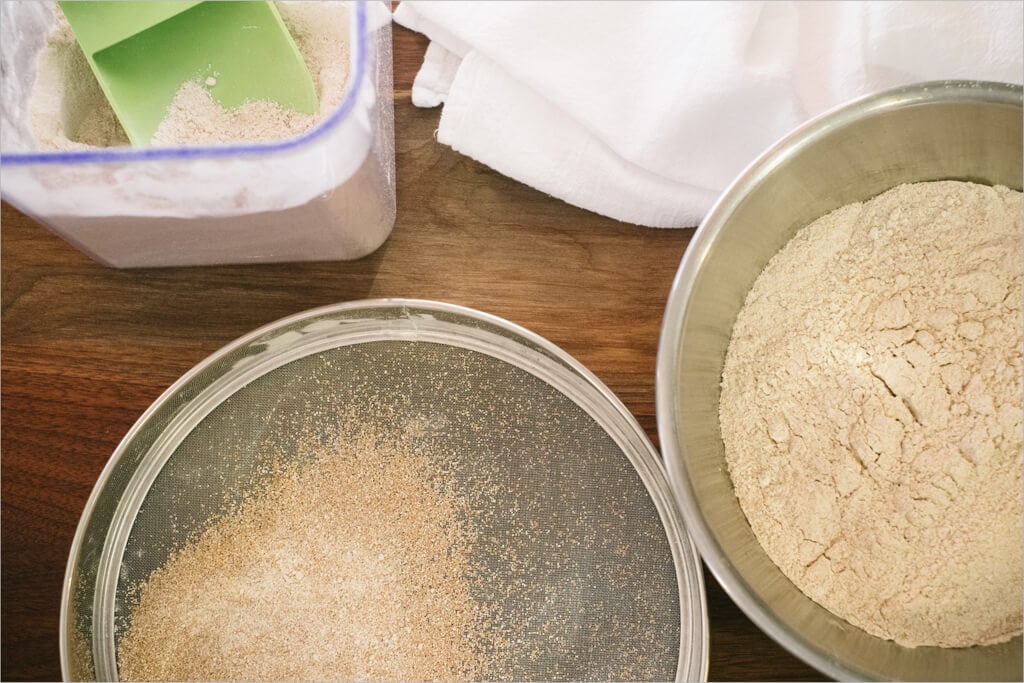 - Create your 500g high extraction flour by sifting your whole wheat flour. The flour that falls through the sifter is what you’ll use now, the coarse bran that remains on the top can be reserved and used to coat your bannetons to prevent sticking instead of using white rice flour